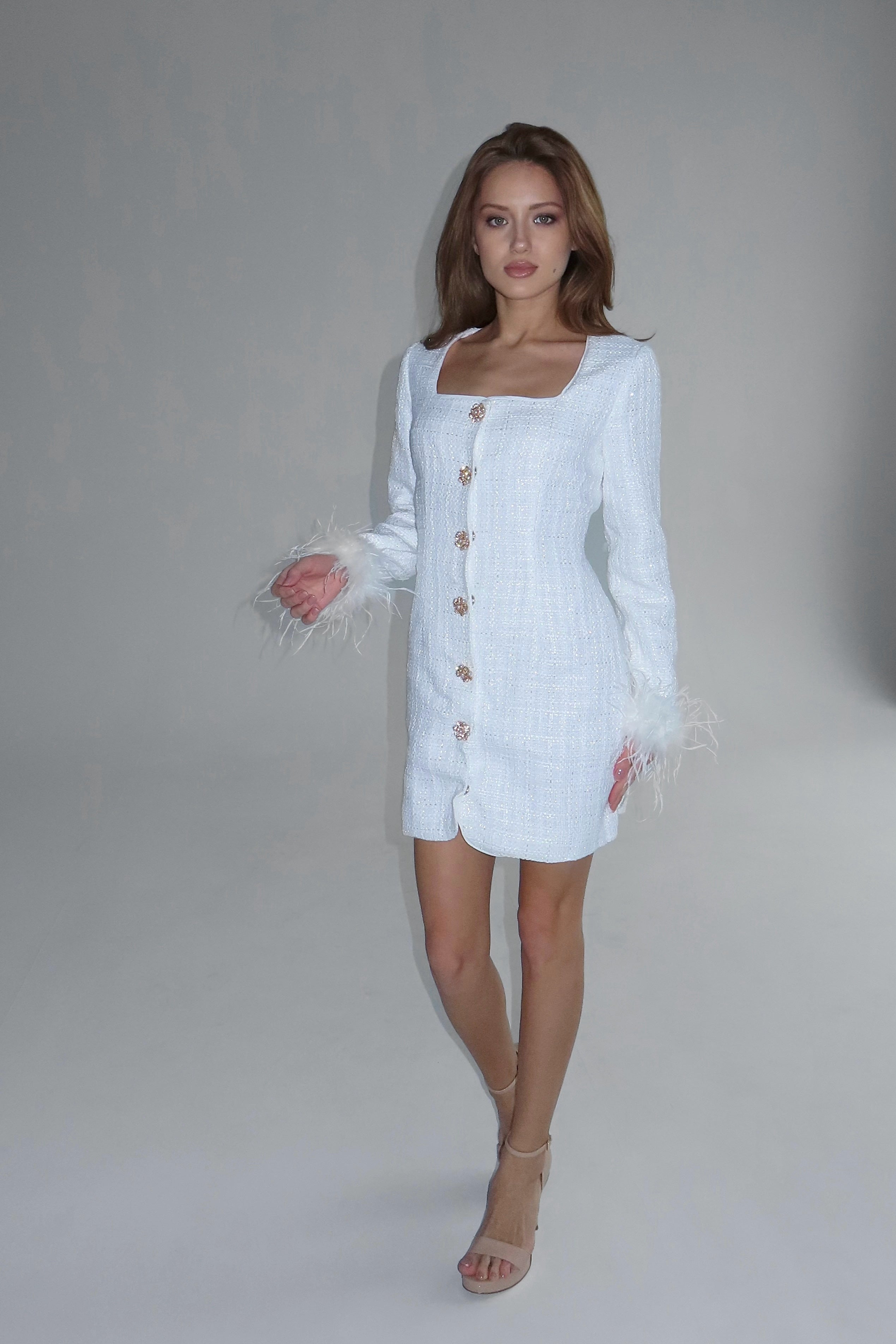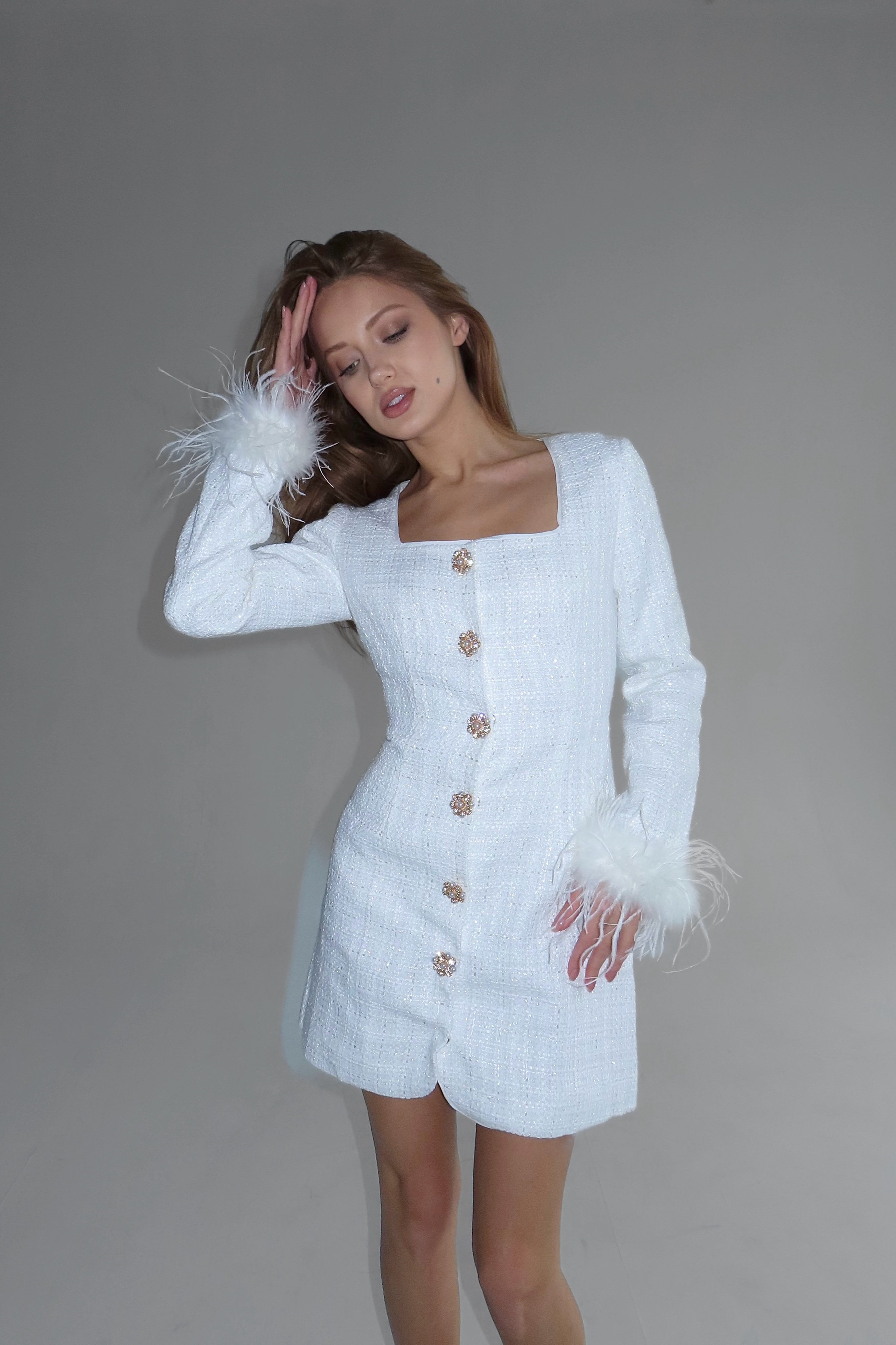 Elevate your wardrobe with the chic sophistication of the Ophelia Dress. Crafted from structured tweed with a soft, woven lining, this button-up mini dress combines timeless elegance with striking detail. Jewel-encrusted buttons and dramatic feather-trim cuffs create a perfect blend of classic and glamorous.