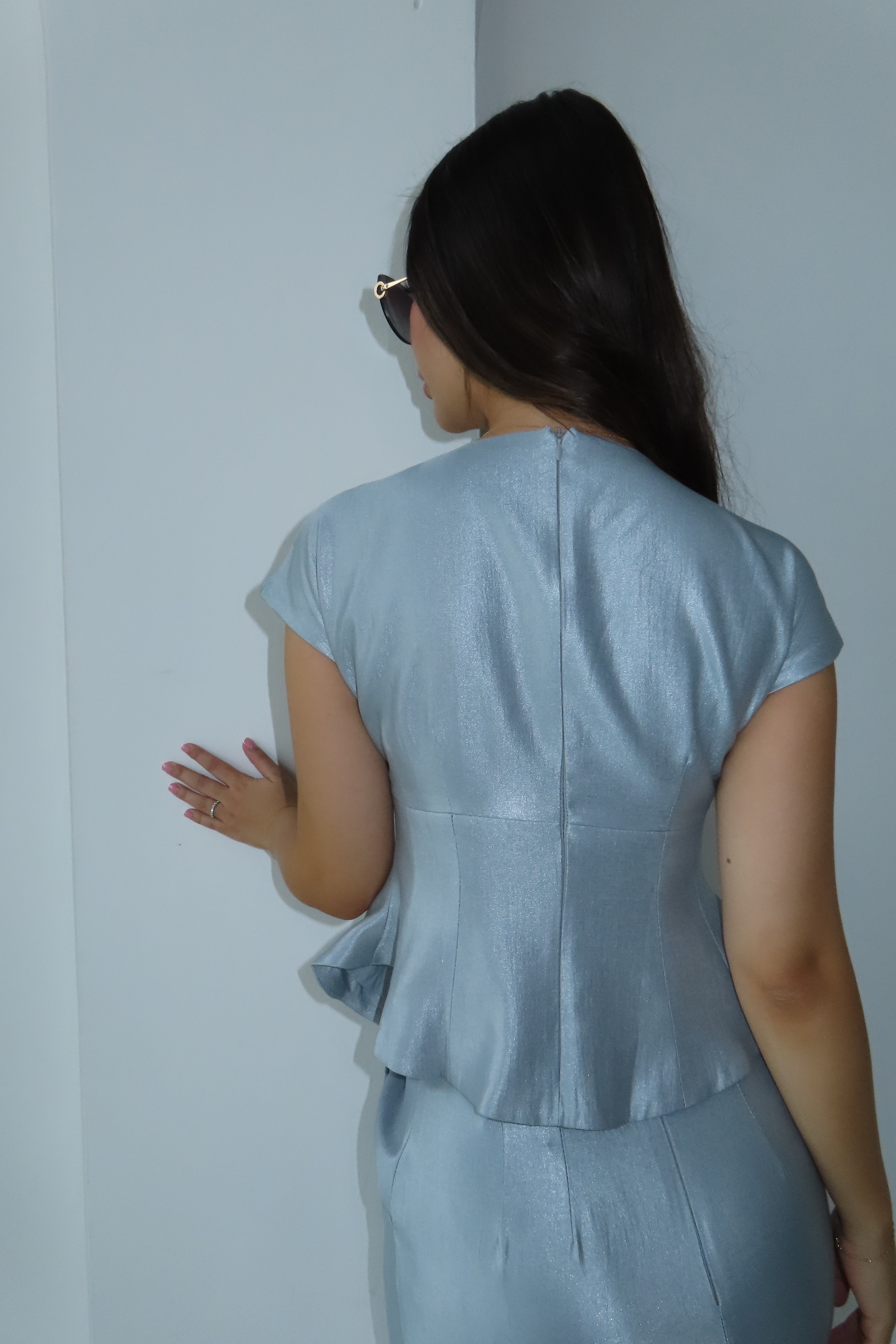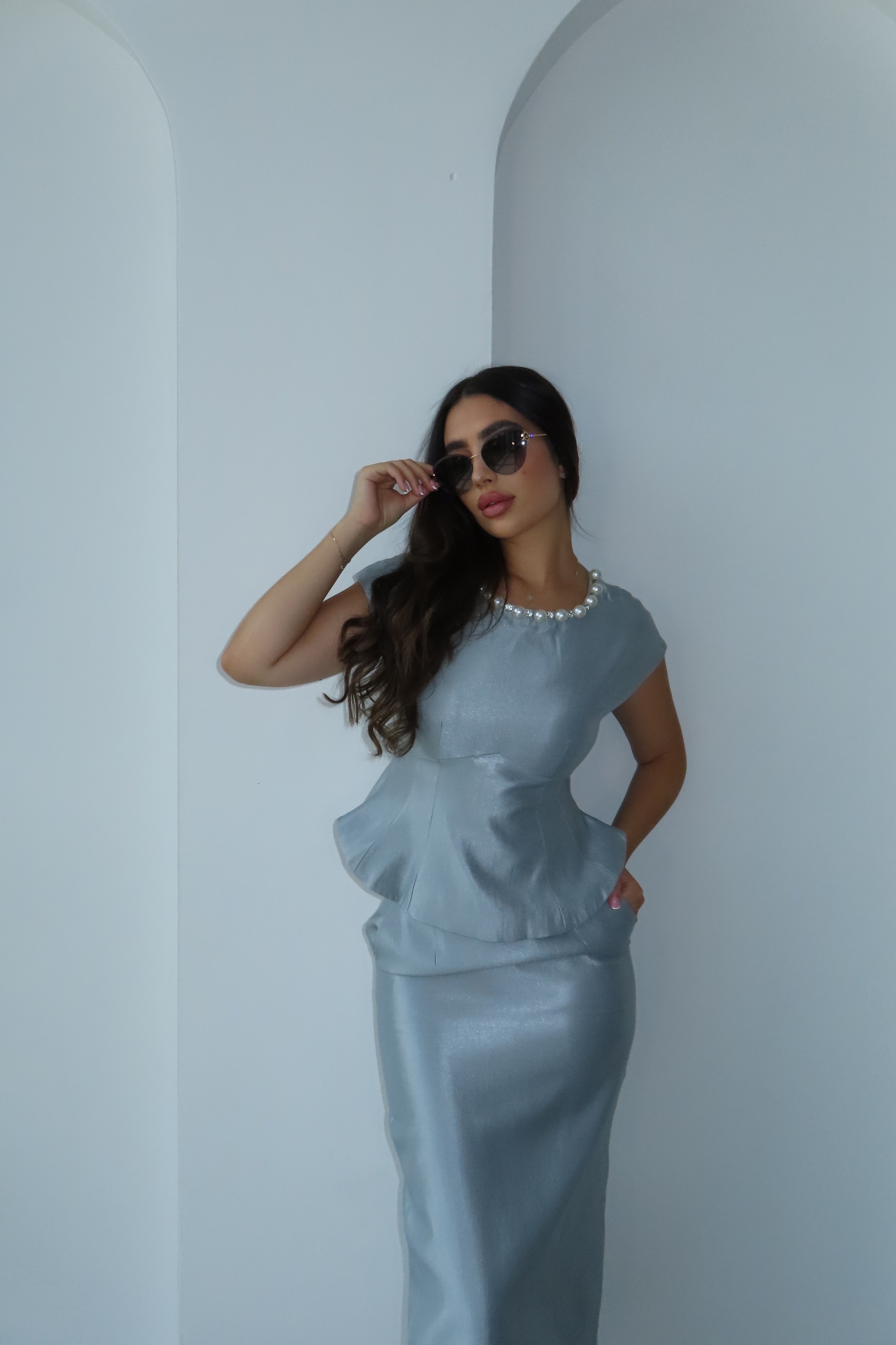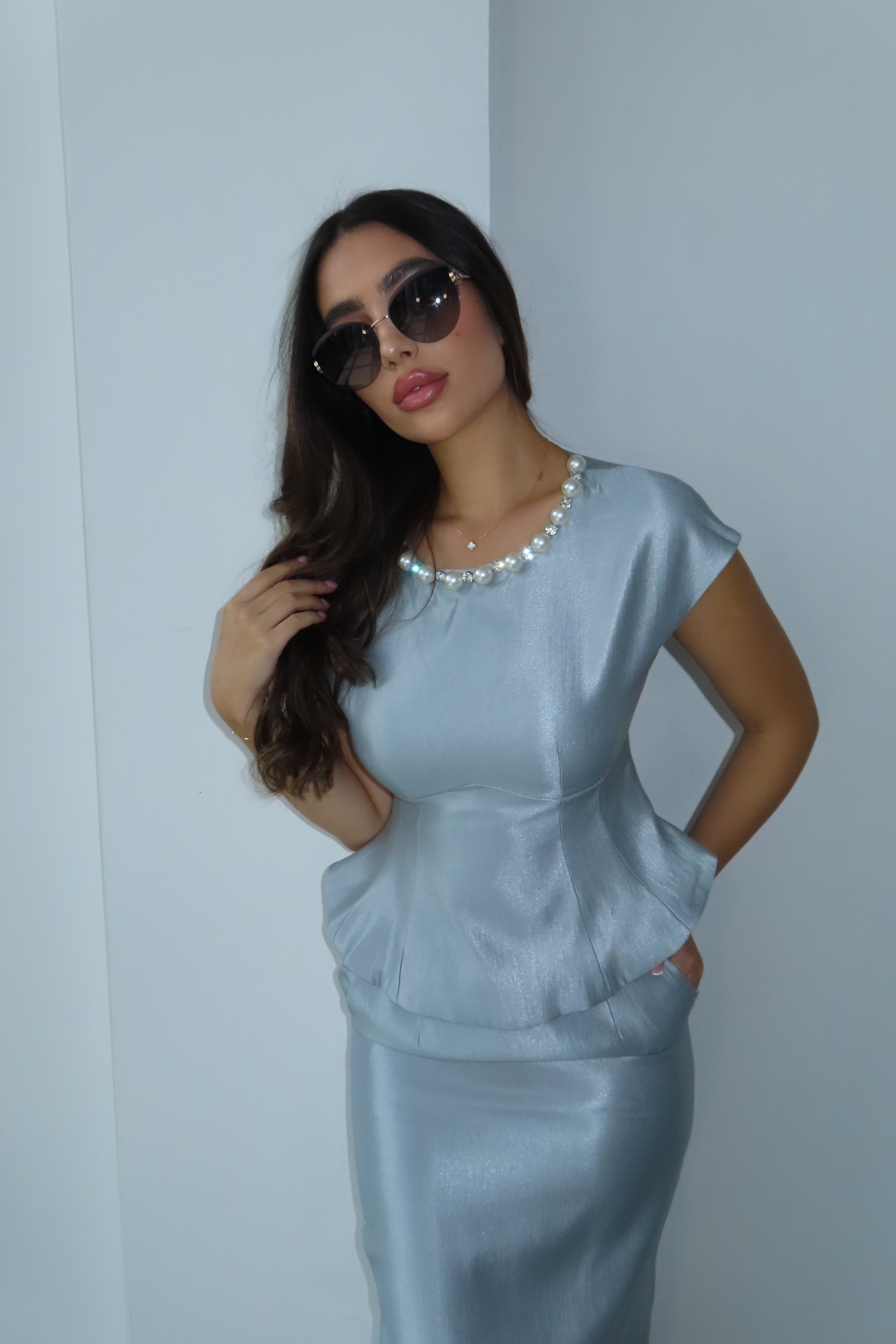 Understated elegance with a timeless silhouette, the Rachel Top is a refined piece made to flatter. Designed with a sculpted bodice, structured shoulders, and a soft peplum hem, this grey satin piece features subtle darting to highlight the waist and a delicate faux pearl neckline for added charm. Perfect for formal events or elevated workwear.