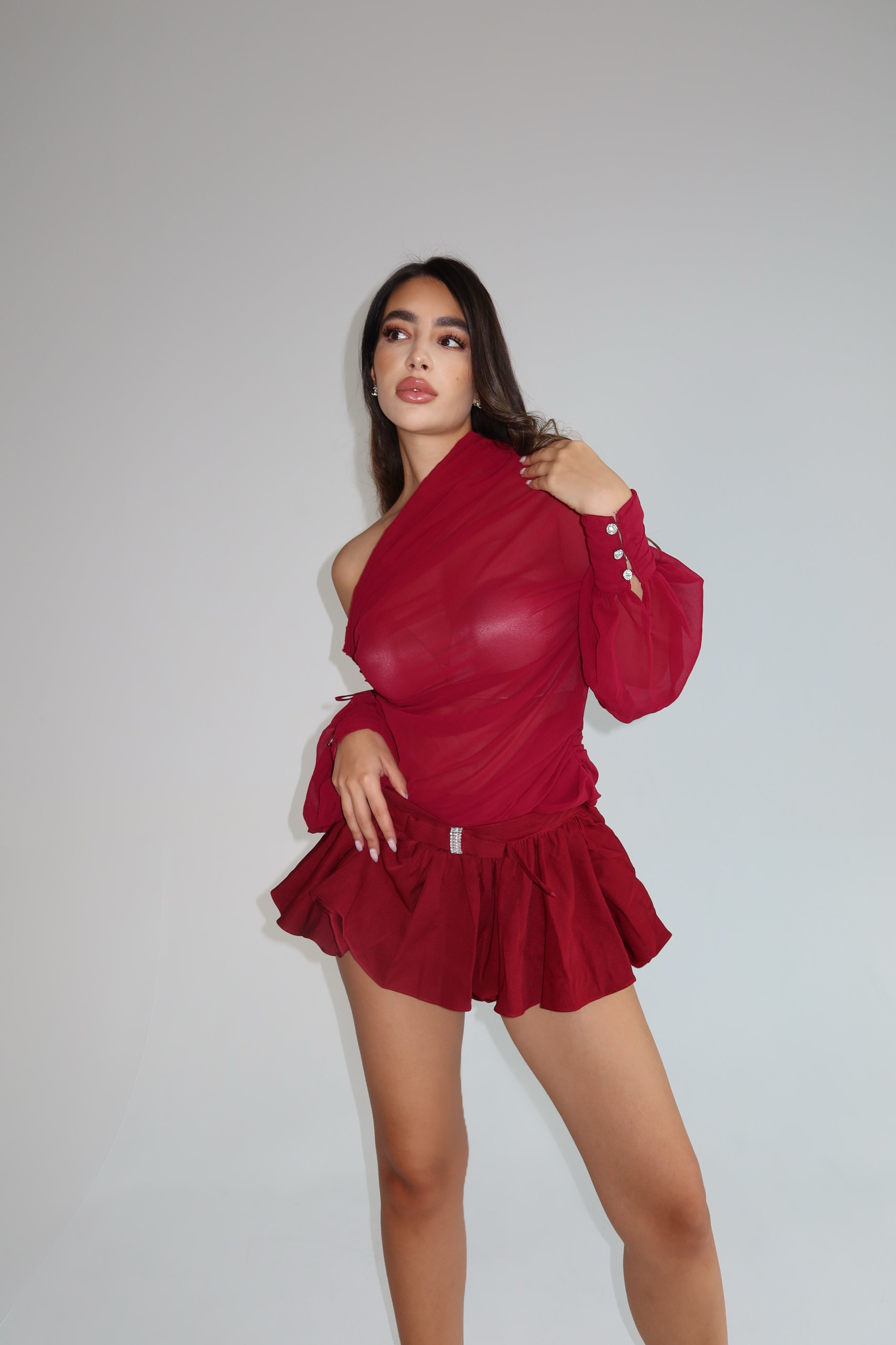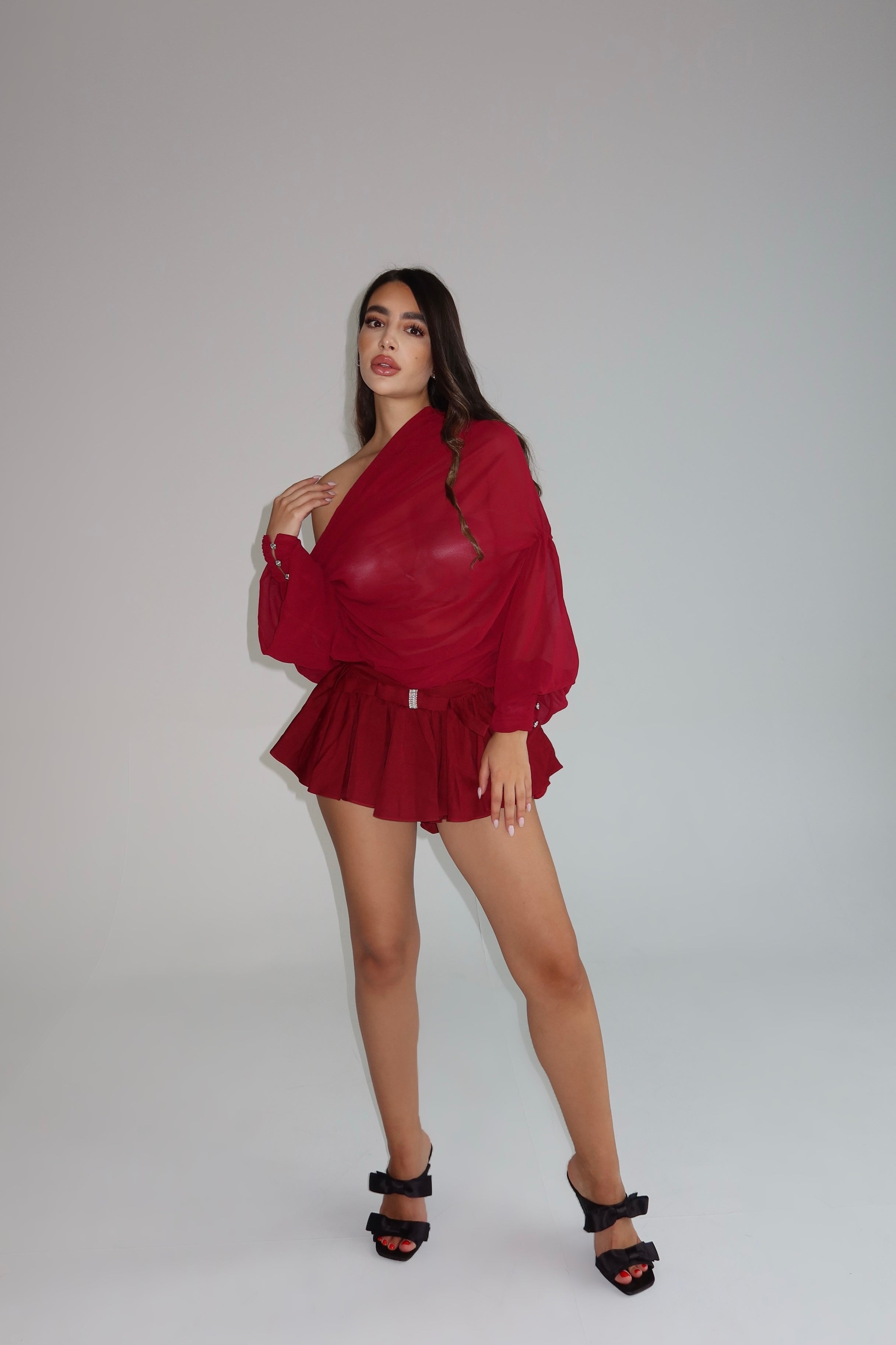 The Erica Set is a sultry two-piece designed to balance allure with comfort. Featuring an off-shoulder long sleeve top paired with a flirty mesh mini skirt, this set brings effortless elegance with a playful edge. The skirt is thoughtfully designed with built-in shorts, giving you the confidence to move freely while still keeping a chic, high-fashion silhouette. Available in red for timeless sophistication, the Erica Set is perfect for holiday parties, romantic dinners, or nights out where glamour is non-negotiable.
