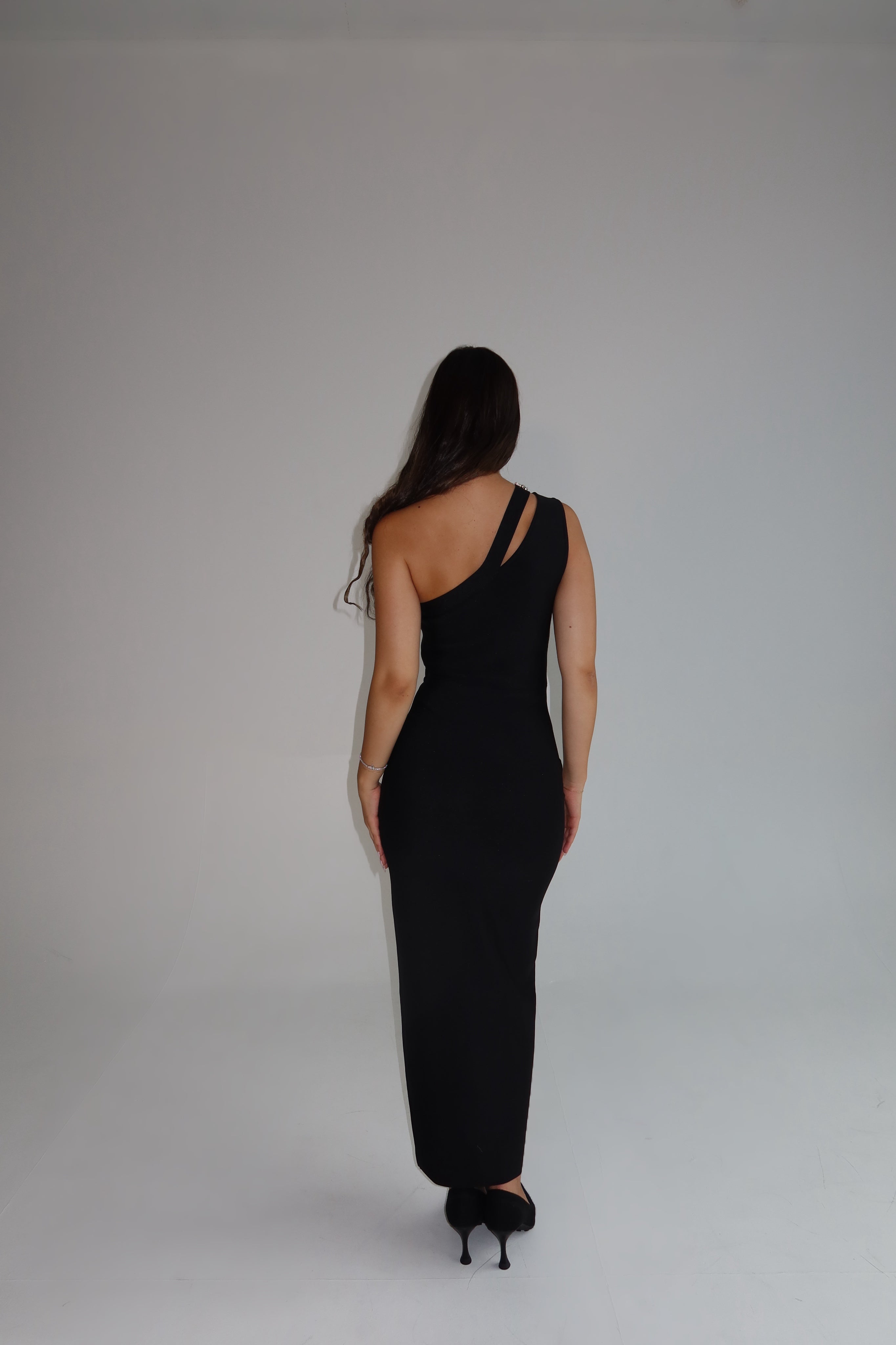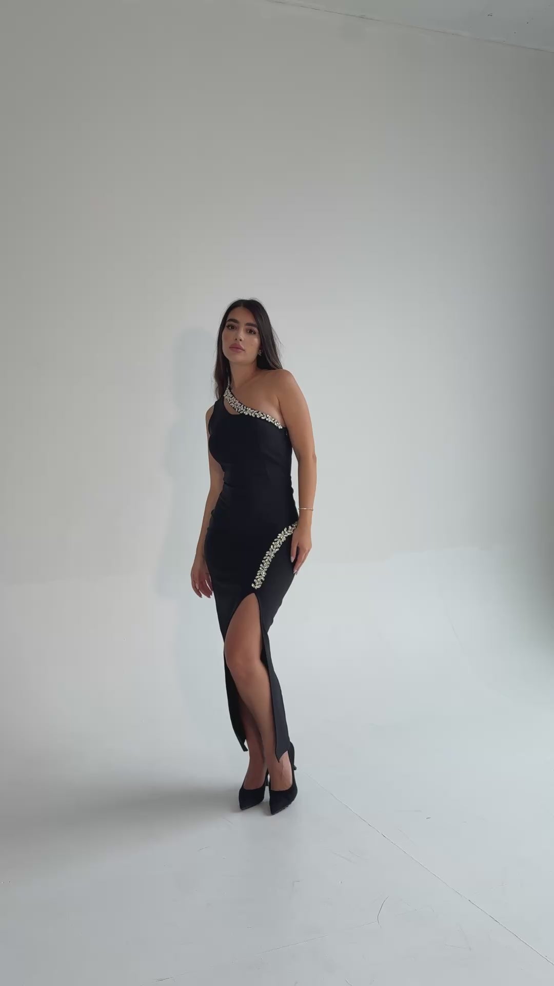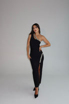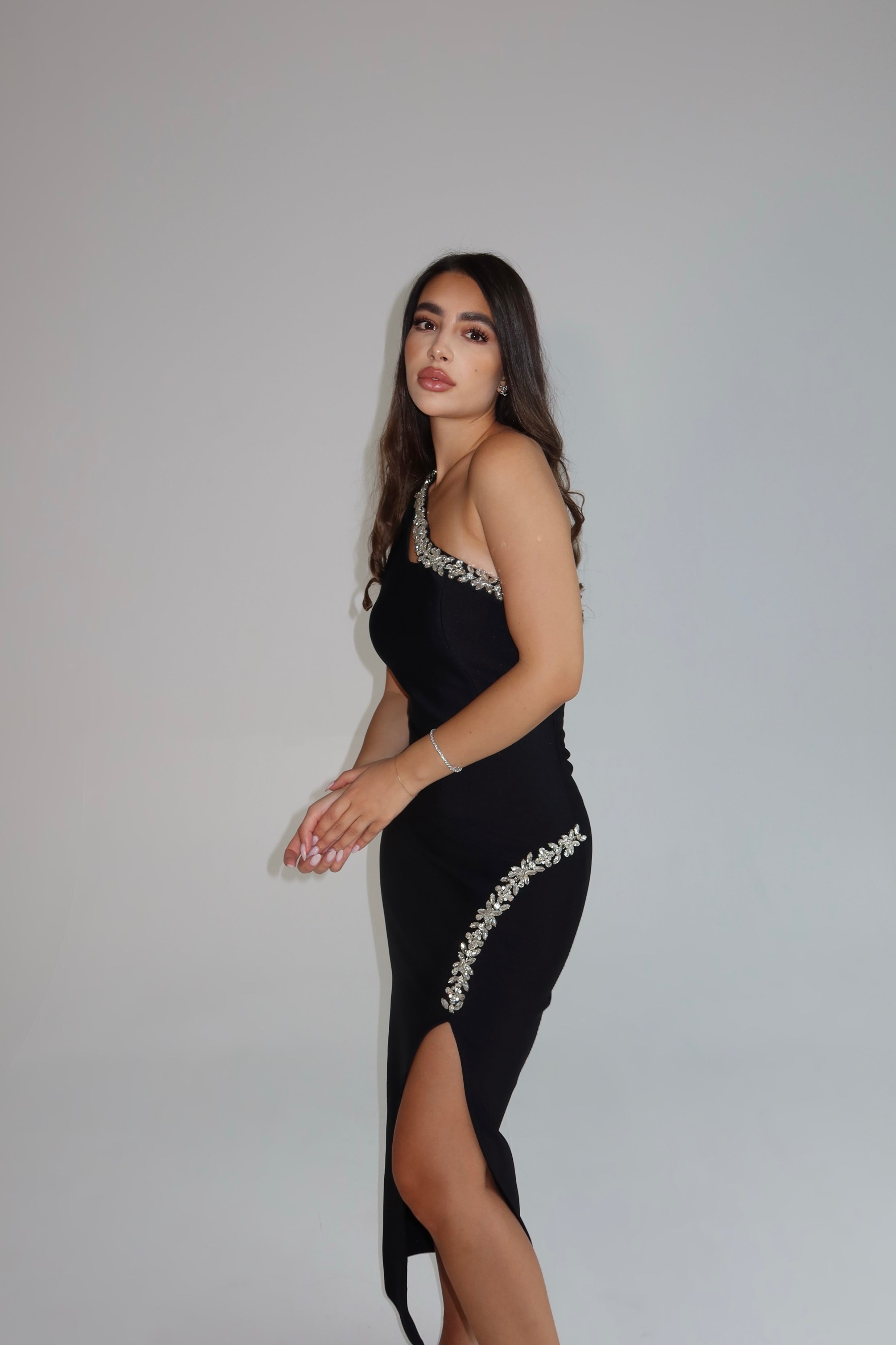 The Maristella Gown is the definition of modern opulence. Designed with a sculpted one-shoulder neckline, it features shimmering silver crystal embellishments along the shoulder and hip—contouring the body with a sleek, luminous line. The thigh-high slit adds refined drama, while Luxestilo’s premium bandage fabric hugs and shapes your silhouette with seamless precision.