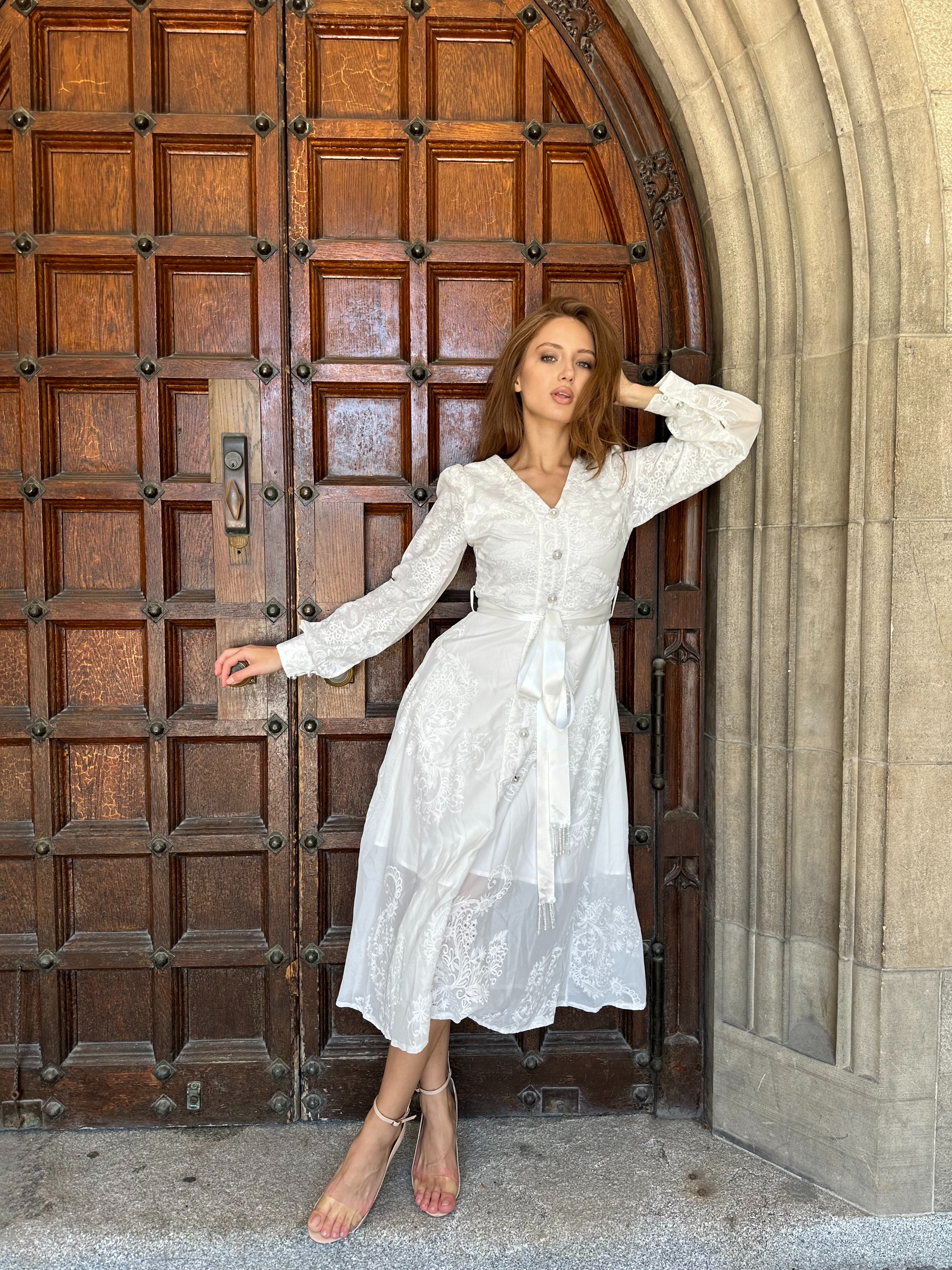 Romantic elegance redefined — the Isabella Dress is a lace dream with regal undertones. Crafted entirely in intricate white lace, this midi dress features long bishop sleeves, a high neckline, and a cinched waistline that flows into a graceful A-line skirt. Every stitch reflects meticulous attention to detail, making it a timeless statement piece for refined affairs.