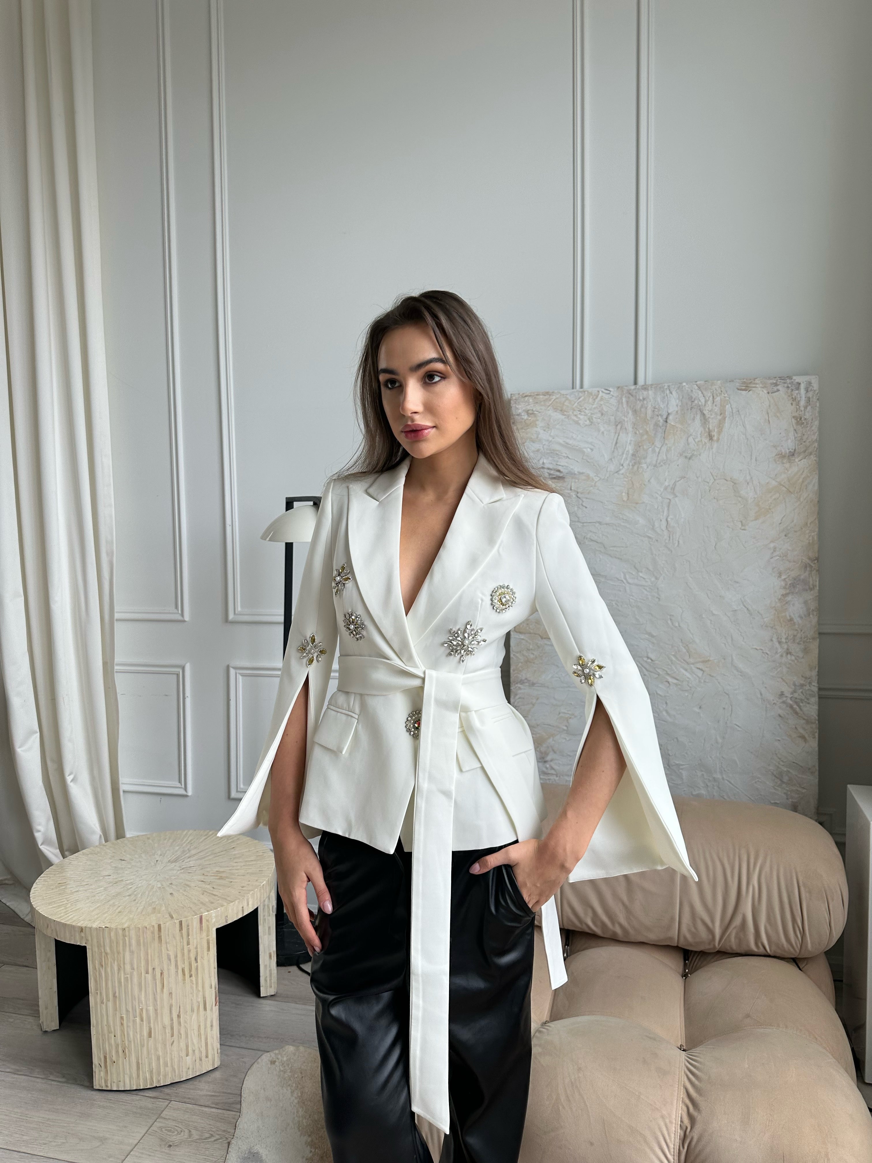 Introducing Livia, the white blazer of your dreams, expertly crafted from the finest worsted cotton. Adorned with strategically placed jewels for an elegant sparkle, this blazer features cutouts at the elbows for a subtle flared detail and a tie-up belt to cinch the waist. Whether paired with jeans for an effortlessly elevated daytime look or styled with a skirt for dressier occasions, Livia brings polished charm and luxe comfort to every outfit.