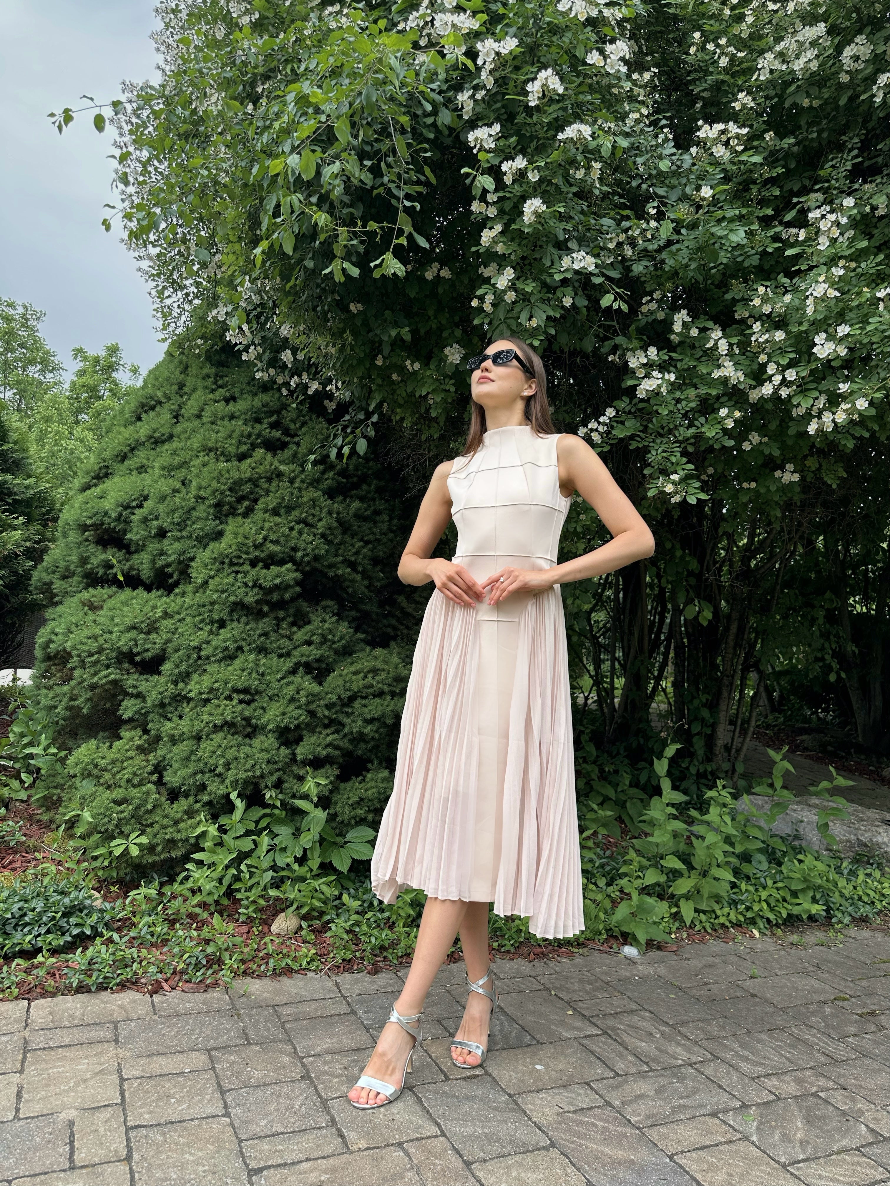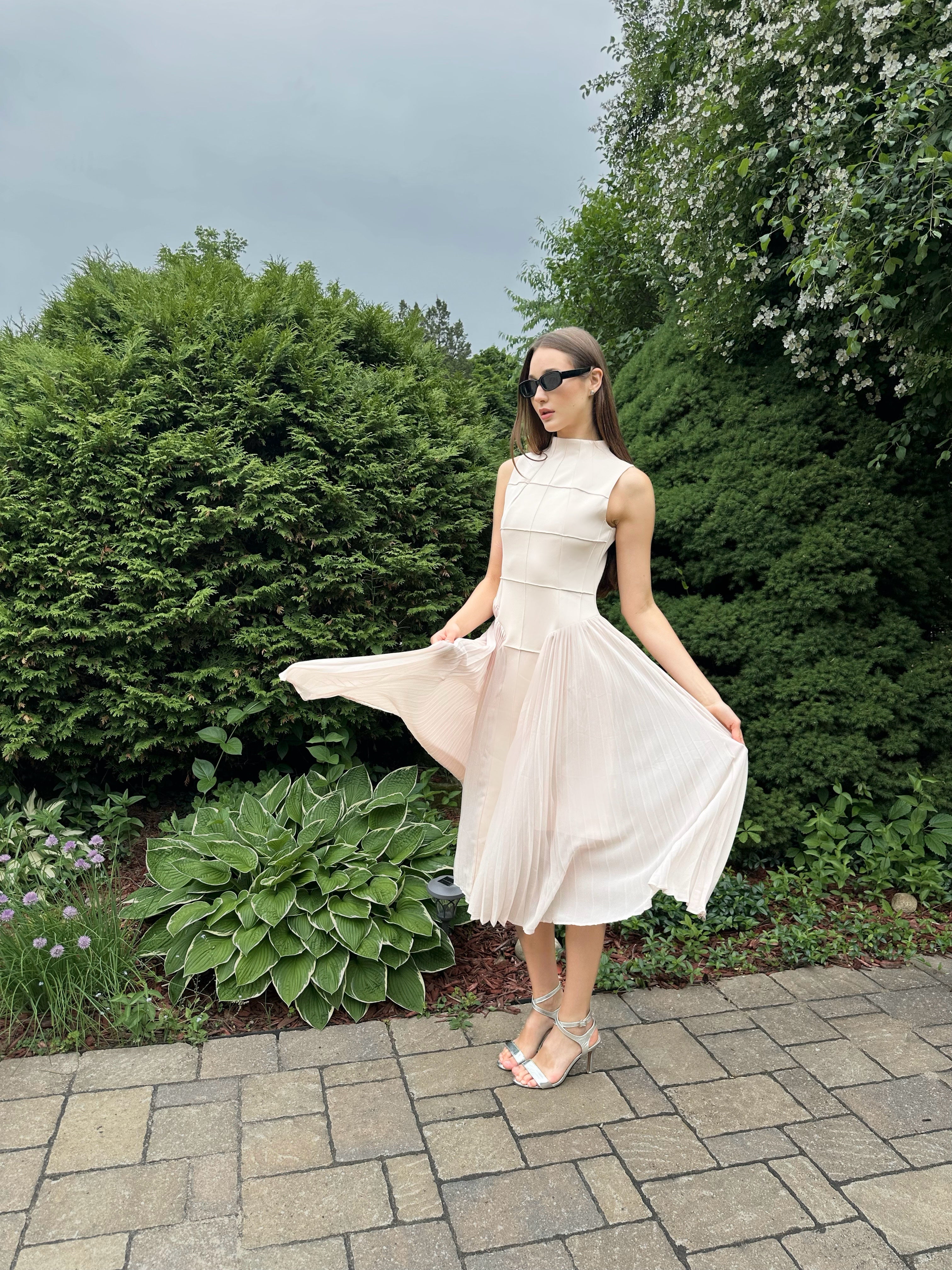 Elegance redefined — the Grace Dress is a timeless midi dream in soft blush. Featuring a high neckline, sculpted bodice, and flowing pleated skirt, it captures refined femininity with every movement. Whether you're attending a daytime garden event or evening soirée, Grace offers an effortlessly polished finish.