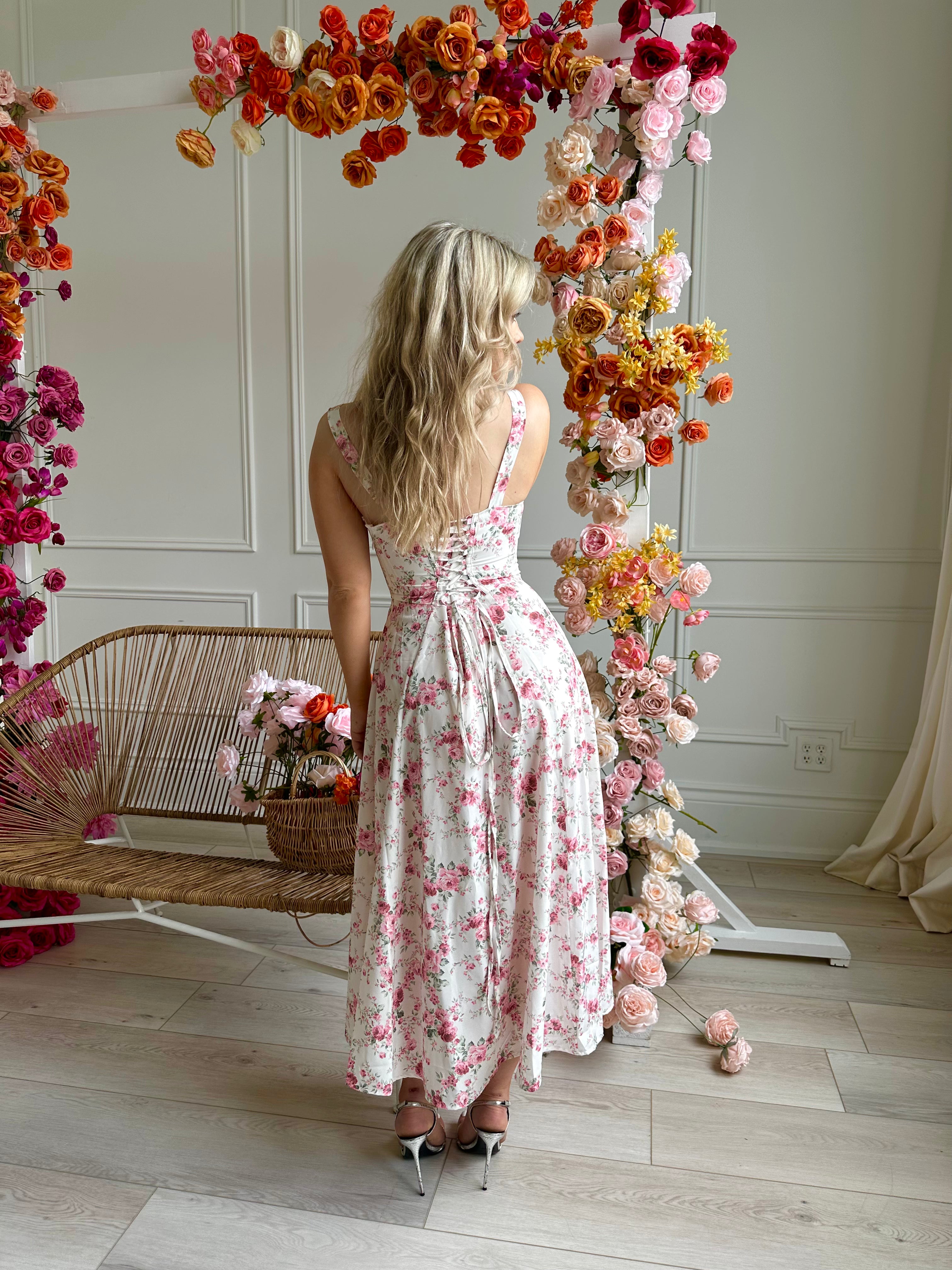 Crafted with attention to detail, this dress features a tie-up back that cinches at the waist for a customizable fit, enhancing your curves in all the right places. The feminine floral print adds a touch of whimsy, while the flowing skirt brings movement and grace to your every step.