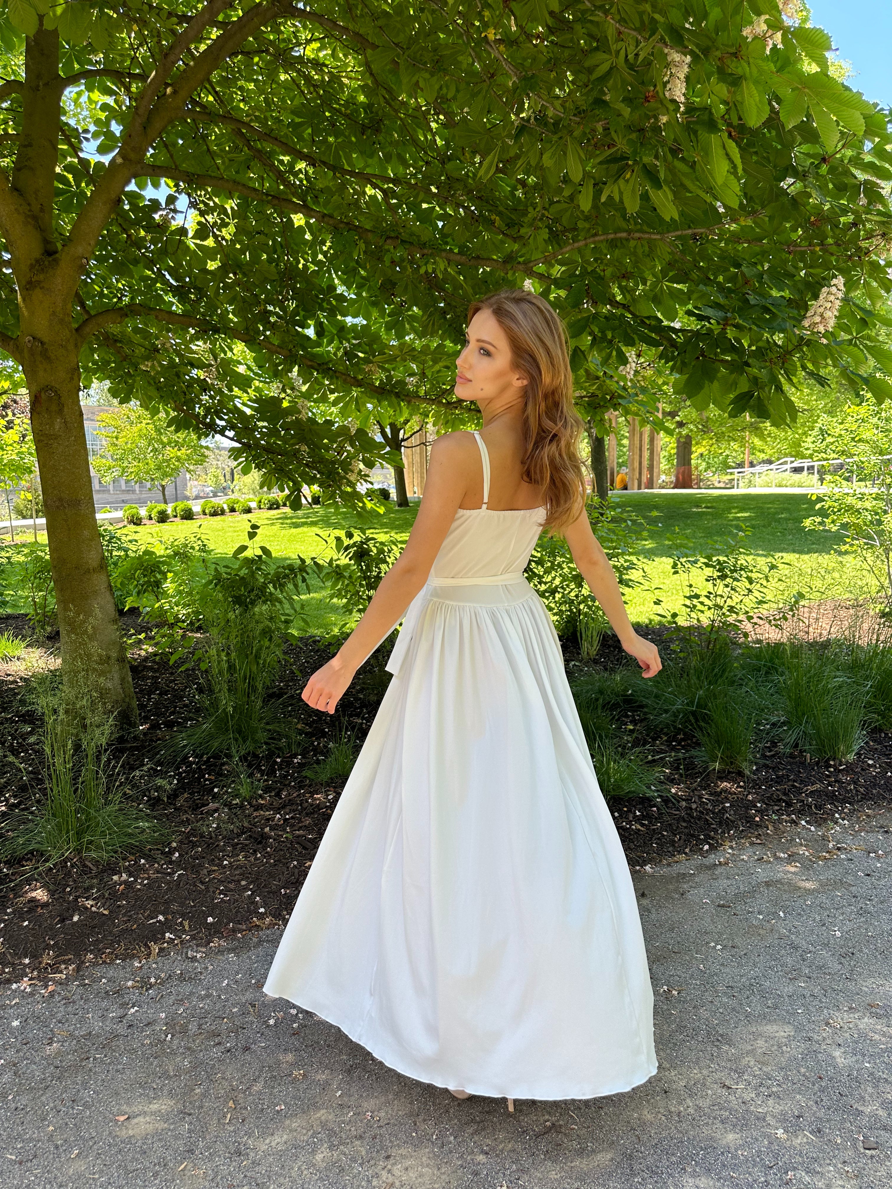 Breezy, effortless elegance — the Mariah Dress was made for sun-drenched strolls and summer escapes. With its flowing silhouette and pristine white hue, this maxi dress brings grace to every step. Delicate spaghetti straps and a square neckline frame the collarbone, while structured bodice paneling creates a flattering, tailored fit that’s both refined and relaxed.